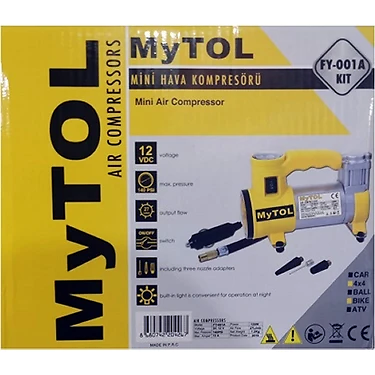 MyTOL FY-001A Mini Hava Kompresörü otomobil, motosiklet, bisiklet lastiği, şişme yatak, su topu, futbol topu vb ürünlerin şişirilmesi için gerekli olan havayı sağlayan pratik bir üründür. LED aydınlatma ile gece ortamında da kullanılabilir.